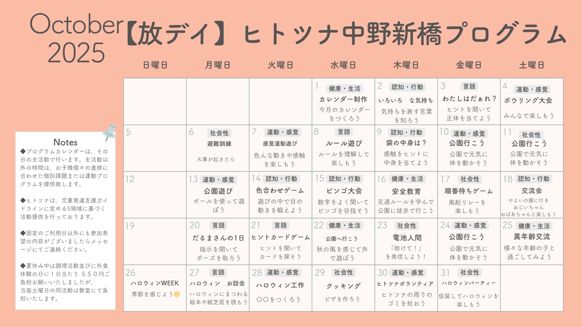 10月プログラムカレンダー(放課後等デイサービス) 2025.10.1 10月の放デイプログラムカレンダーです🎃👻 古い投稿 10月プログラムカレンダー(児童発達支援) 新しい投稿 11月プログラムカレンダー > 行事予定 > 10月プログラムカレンダー(放課後等デイサービス)