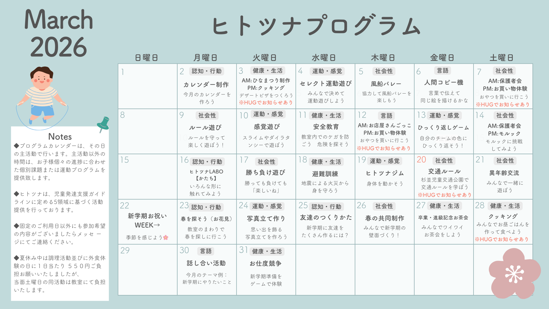 3月のプログラムカレンダーです🌹