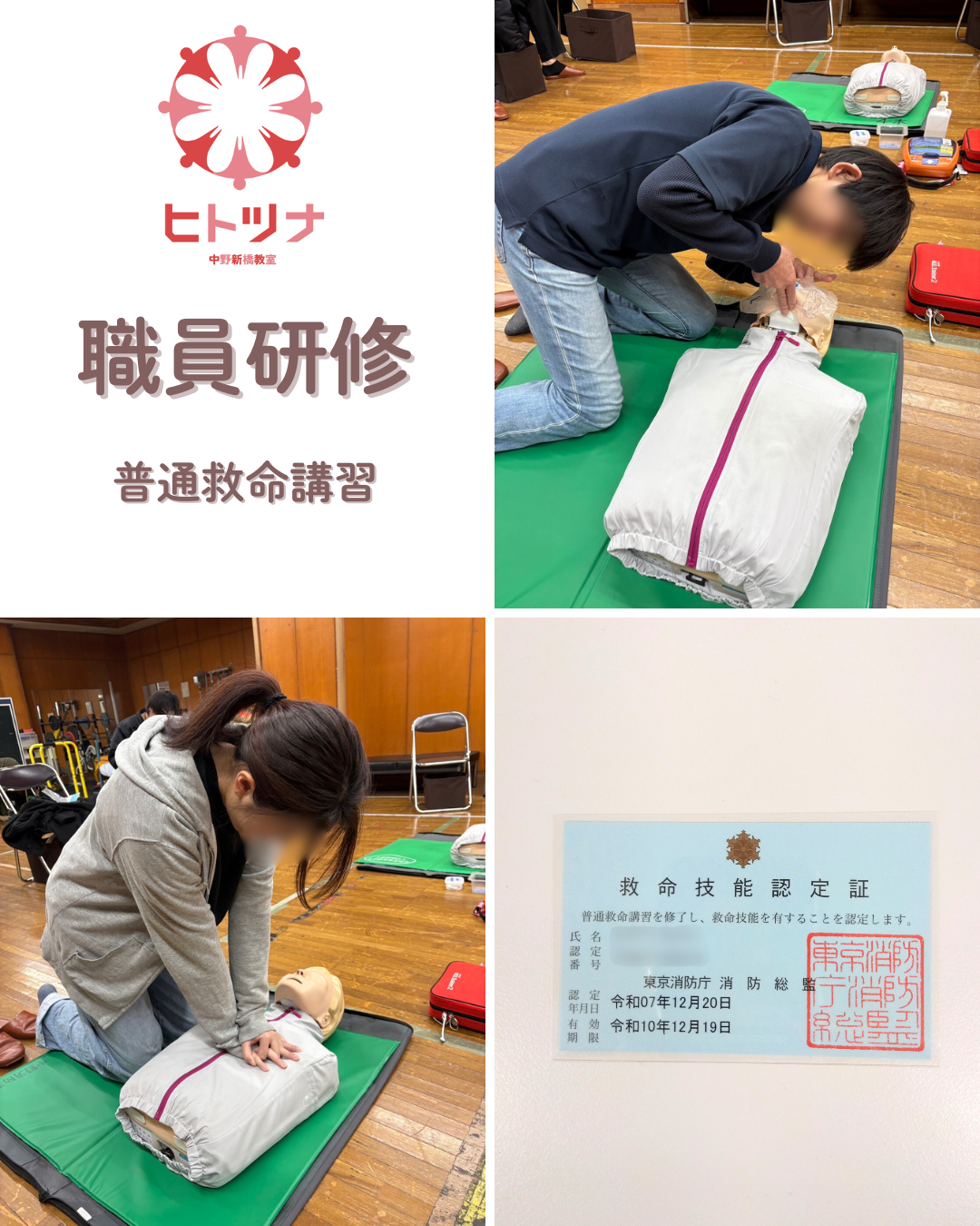 こんにちは!ヒトツナ中野新橋教室です🌟中野消防署にて行われた普通救命講習に職員2名が参加してき…